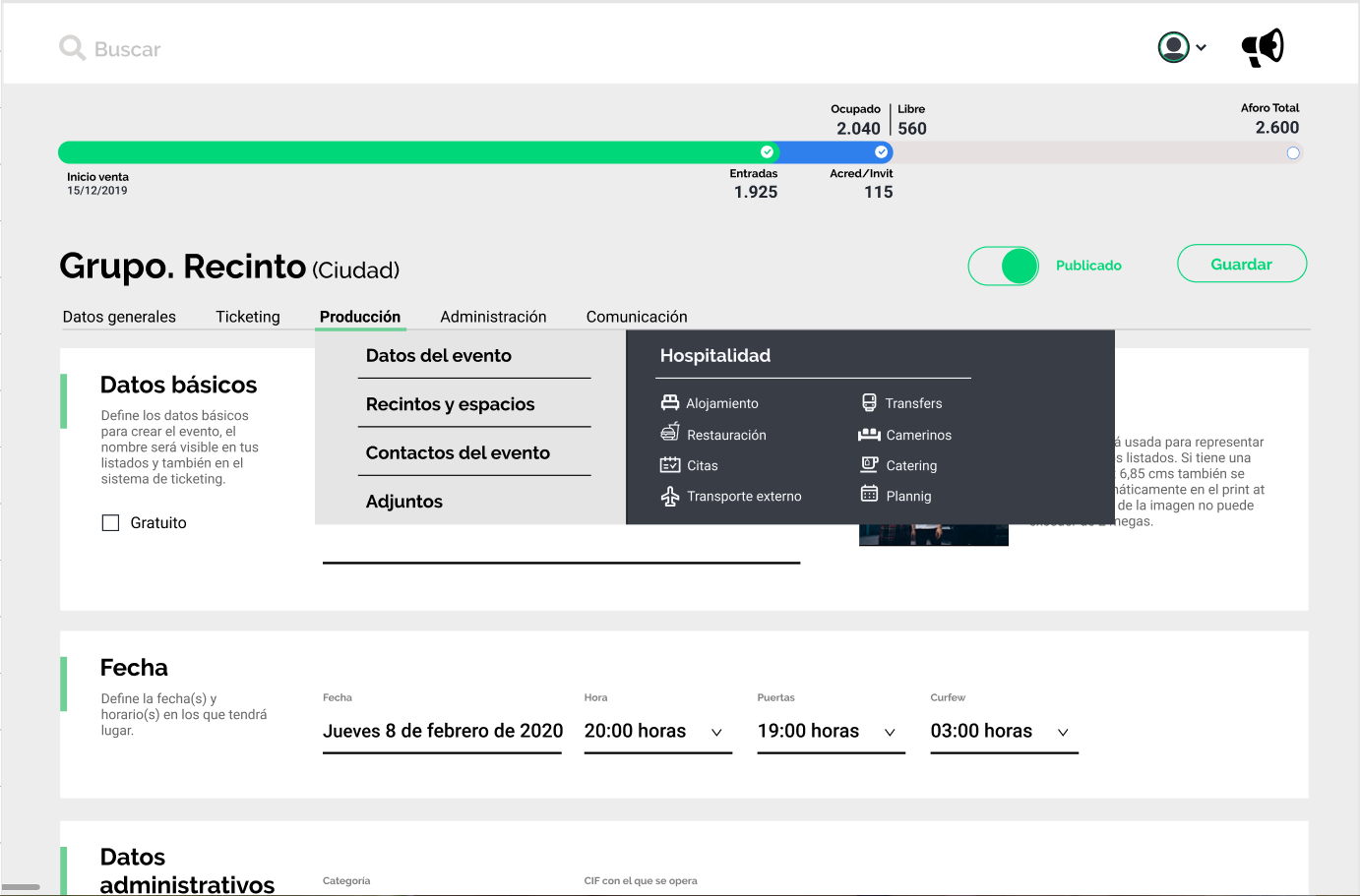 Podrás gestionar las acreditaciones de artistas e invitados de los mismos, así como gestionar el acceso de vehículos, pudiendo enviar la acreditación de los mismos así como asignarle la zona de aparcamiento en el evento.